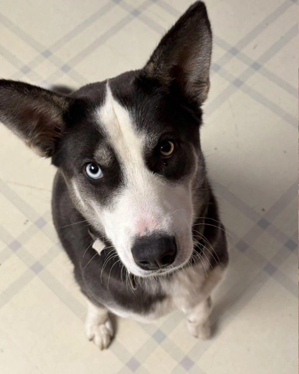Ashes is a female Siberian husky mix, about 35 lbs. She is pretty and has one blue eye and one green eye. Ashes has a sweet disposition, very affectionate, active with a “soft mouth” and cat-friendly. She loves learning and knows basic commands