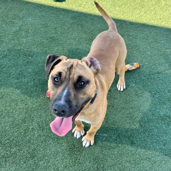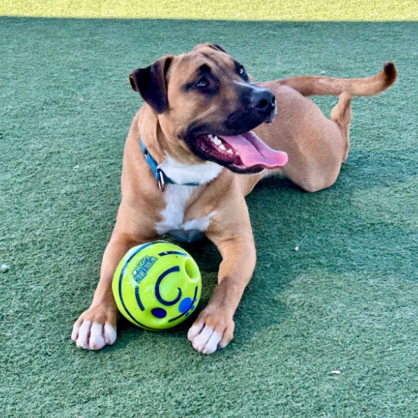 Rocky is a very well-rounded guy and truly just wants to have a good time. He still has some youthful energy but he easily focuses that into a variety of activities and then calms nicely. Rocky loves playing with toys and is happy to play somewhat independently. He has the patience to work on puzzles and even try out some agility equipment! Rocky has an excellent sit and enjoys affection. He does need some work on leash but he seems very trainable.